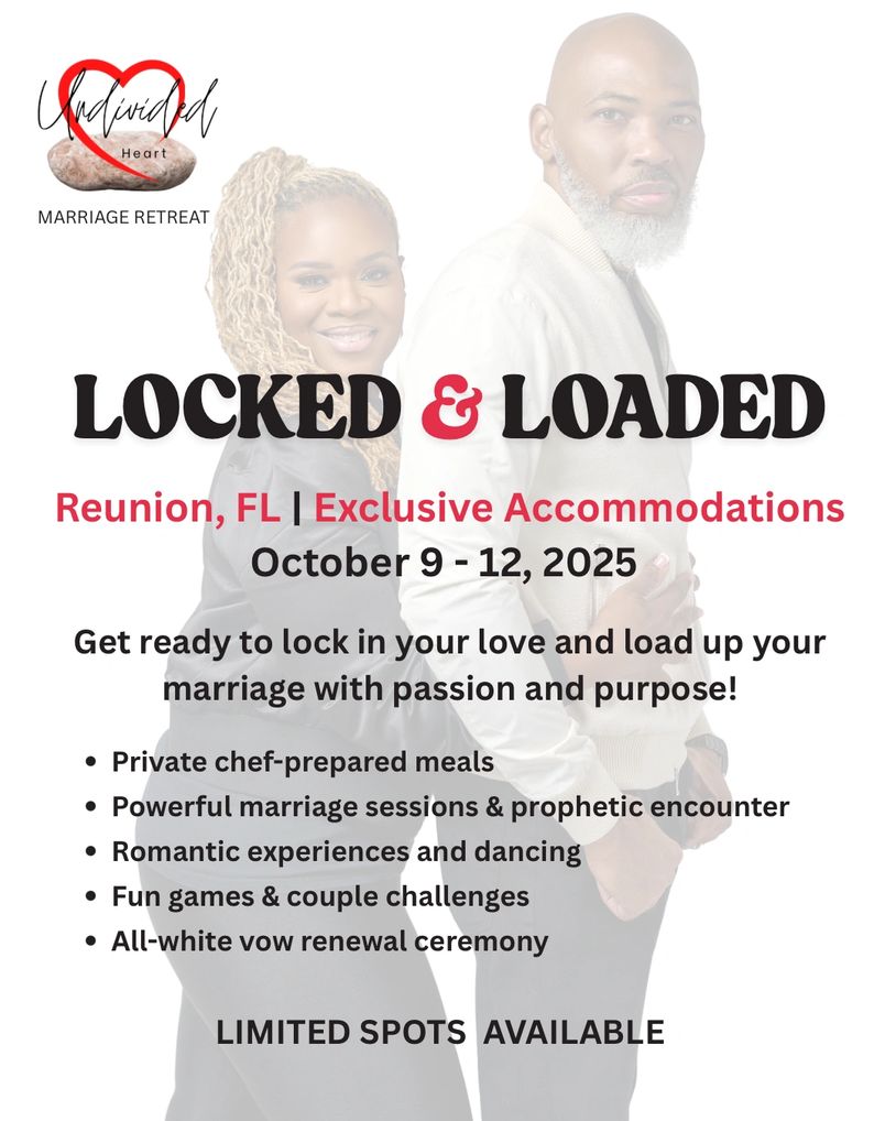 Join us for Undivided Heart Marriage Retreat 2025 themed “LOCKED & LOADED” The retreat will occur in Reunion, Florida, on October 9- 12, 2025. This retreat is an all-inclusive retreat meaning sessions, meals and sleeping accommodations are included in the price. Are you ready to get Locked & Loaded in your marriage? Are you ready to recommit, reconnect, renew, refresh, recharge and revive your marriage? If so, this is the marriage retreat for you!! We are ready to pour into each couple!! We have some amazing couples who we trust to pour into your marriage. We are going to laugh, eat, cry, and have lots of fun!! We also enjoy a vow renewal ceremony where you get to recommit yourself to your spouse. Now, it's time for you to do the hard part. Invest in your marriage with this small price. I can promise you will not regret your investment. Register today at